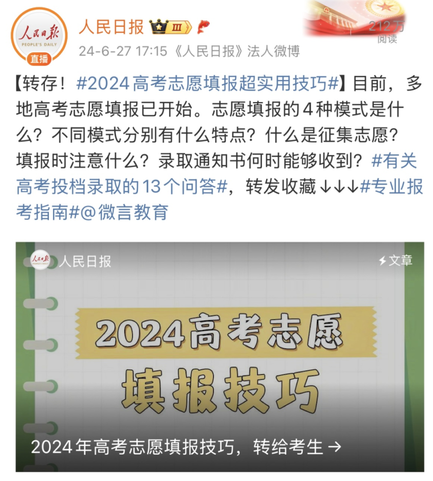 人民日报为广大考生提供高考志愿填报技巧 图源:人民日报微博